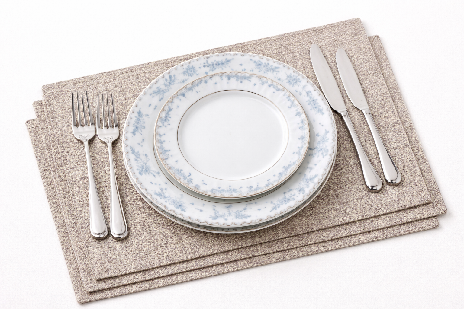 Create a refined and timeless dining experience with this classic floral dinnerware place setting, featuring delicately patterned porcelain plates paired with neutral fabric placemats and polished stainless steel cutlery. The soft blue floral detailing adds a subtle decorative touch while maintaining a clean, minimalist aesthetic suitable for everyday dining or special occasions.